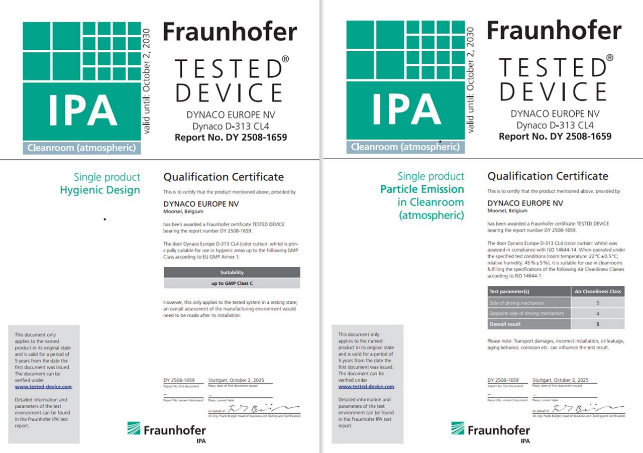 To give decision-makers solid data to base their investments on, the Dynaco D‑313 Cleanroom has been extensively tested by the Fraunhofer Institute for Manufacturing Engineering and Automation IPA. The door is validated for use in Cleanrooms fulfilling Air Cleanliness Class 4 specifications (on the side opposite the drive mechanism) and certified for hygienic design in areas up to GMP Class C according to EU GMP Annex 1. Documented low particle emission during active operation provides third‑party proof that supports qualification, audits and risk assessments in regulated industries.