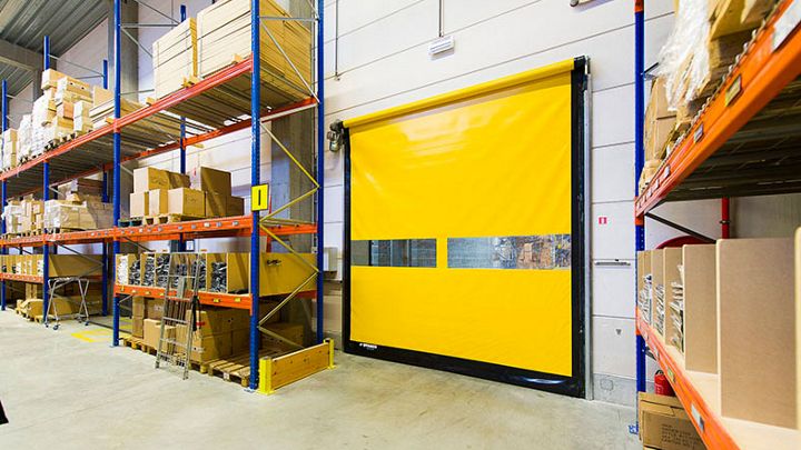 Improve your logistics and public areas, warehouse transport and material handling with a Dynaco D-311 high-speed roll-up door for interior use. - Dynaco