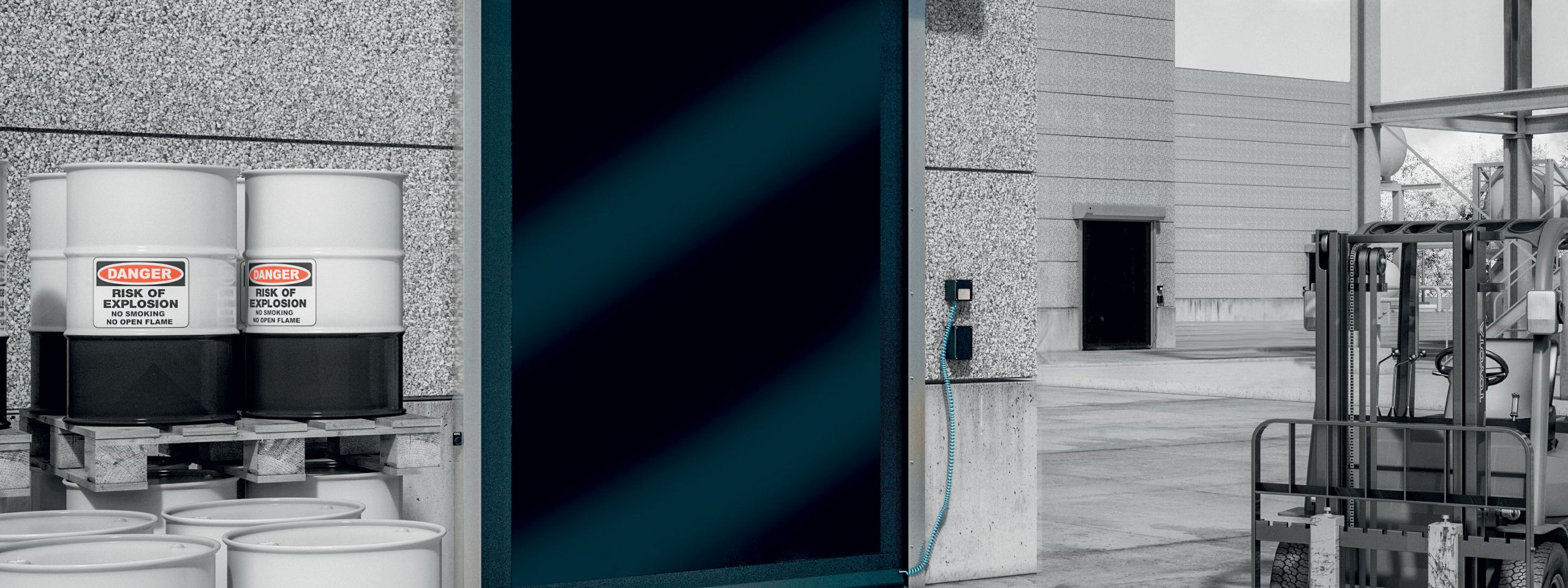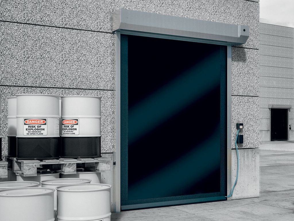 Le porte rapide All Weather sono state progettate per un utilizzo esterno in ambienti a rischio di esplosioni. - Dynaco